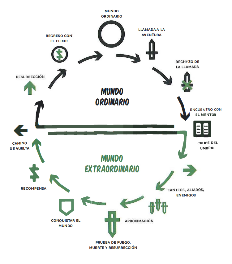 Una llamada a la aventura saca al héroe de la vida ordinaria. Ayudado por un mentor, un secuaz o un guía sabio, el héroe cruza el umbral para adentrarse en lo desconocido.