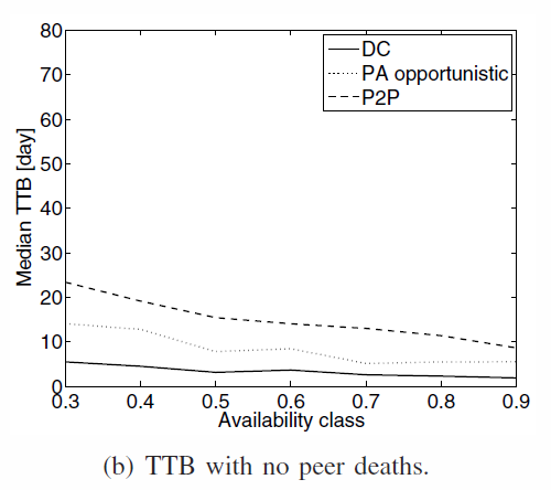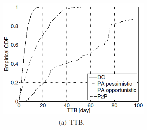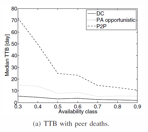 - P2P is the worst : some peers don't backup in time because of the redudancy and the online behavior that can interrupt download