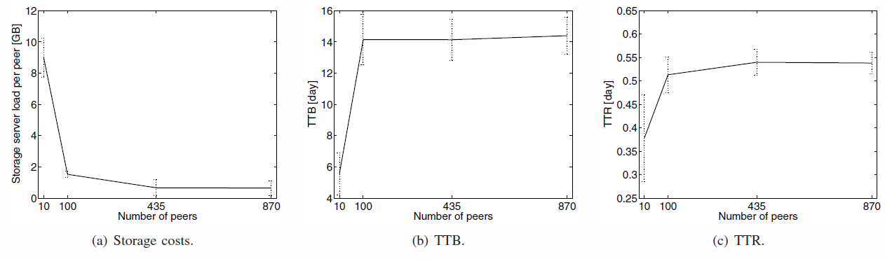 - Costs decrease with the number of peers increasing : more peers to store data, less an the server