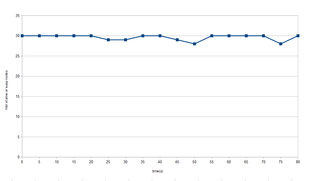 Number of alive + suspected nodes through time with a network with 7\% of message drop since t=0