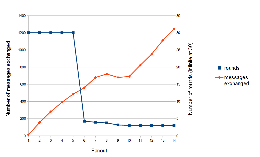 Number of rounds and messages needed to broadcast a message to all the group with an increasing fanout and 7% of message drop