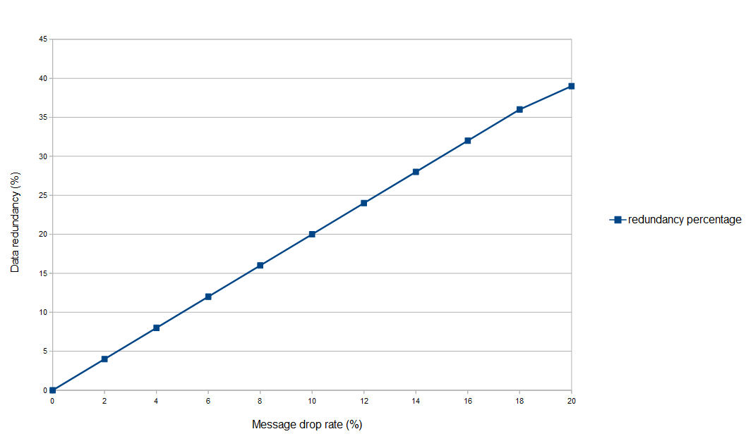 Percentage of data redundancy with an increasing rate of message drop on the network