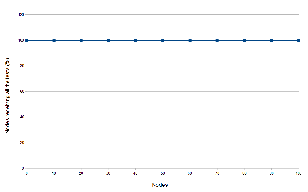 Percentage of nodes receiving tests after a deployment cycle with a growing number of nodes