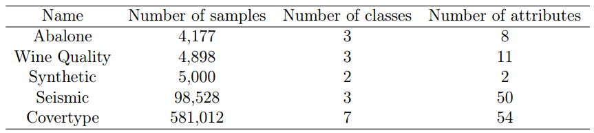 - 5 data sets were selected, raging from 4177 to 58012 instances.