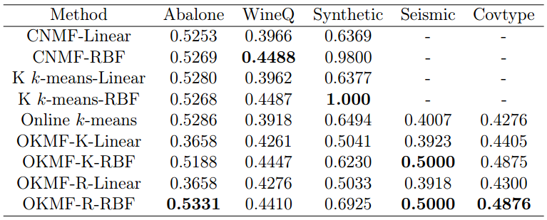 - OKMF has a competitive performance compared with other KMF and clustering algorithms in the clustering task.