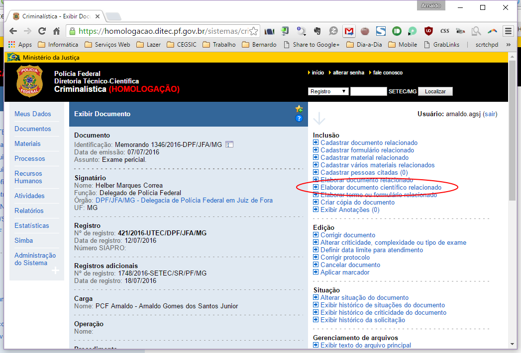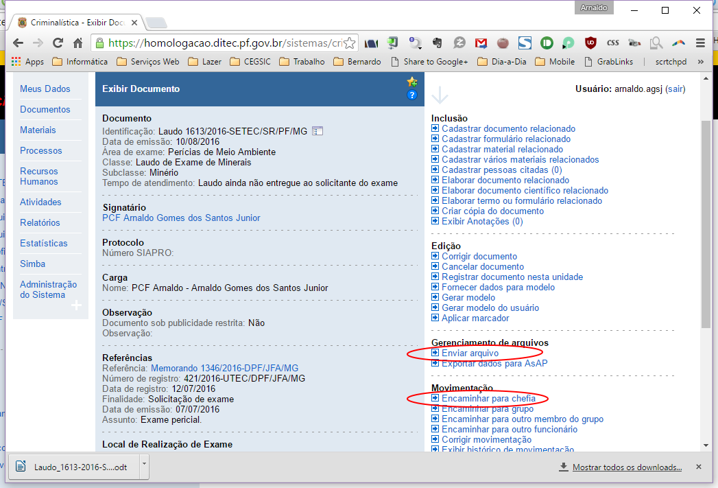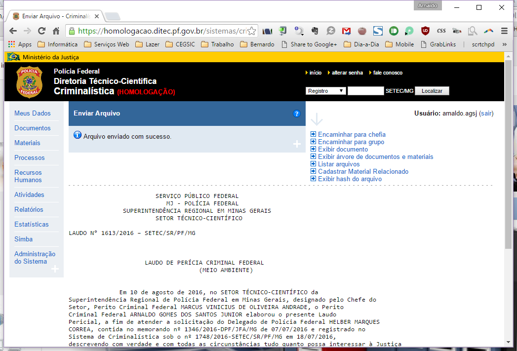 - Usar Criminalística (envio de arquivo / widget Meus Dados)