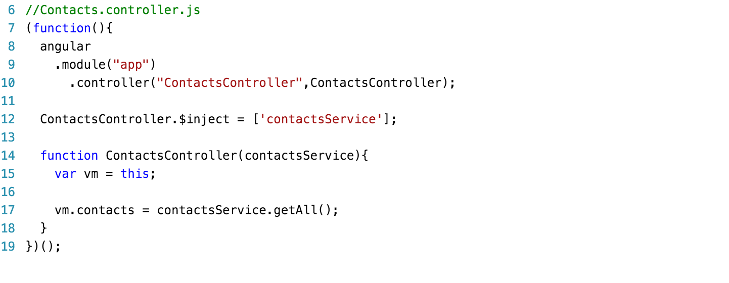 - Use controllerAs for consistency