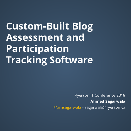 Ryerson IT Conference presentation: Over the past two years, Ahmed Sagarwala, an instructor in the Creative Industries department, has been progressively enhancing a customized course administration tool that facilitates the tracking of class grades and participation by aggregating tweets, scraping blog posts, notifying users using a bot and tracking both online and in-class participation. Learn about development pitfalls, educational outcomes and plans for future improvement, including Natural Language Processing (NLP), a dashboard with visualizations, and the addition of feedback tools.