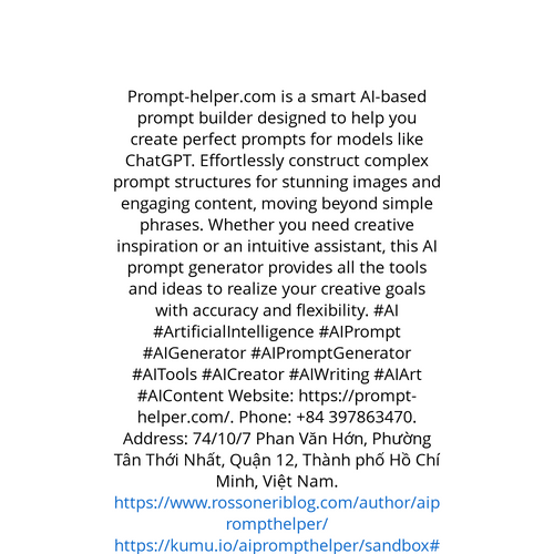Website: https://prompt-helper.com/. Prompt-helper.com is a smart AI-based prompt builder designed to help you create perfect prompts for models like ChatGPT. Effortlessly construct complex prompt structures for stunning images and engaging content