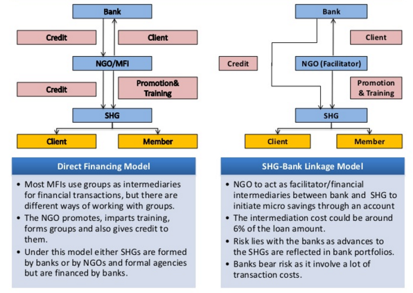 There is an involvement from the concerned NGO before and even after the SHG-Bank linkage. The SHG-Bank linkage programme, which has been in place since 1992 in India, has provided about 22.4 lakh for SHG finance by 2006. It involves commercial banks, regional rural banks (RRBs) and cooperative banks in its operations.