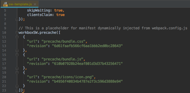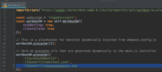 Any new assets under /precache will be automatically precached by SW according to pattern specified in webpack.config.js