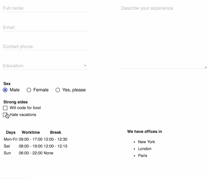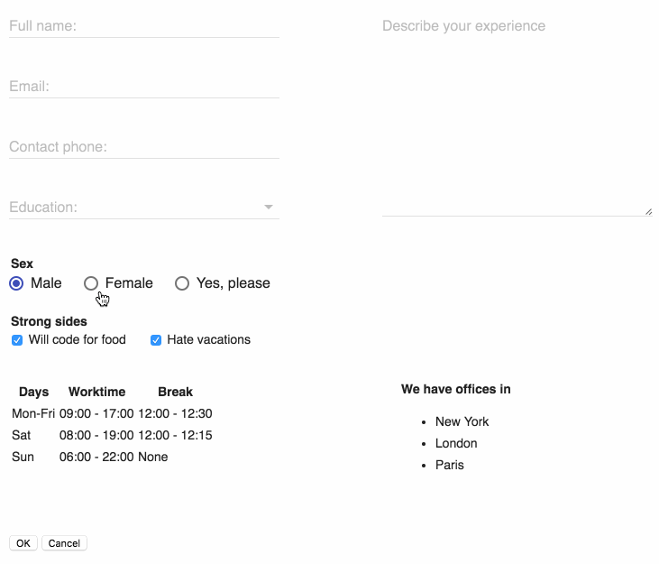 <input type="radio" id="list-option-2" name="sex" value="female" /> Female