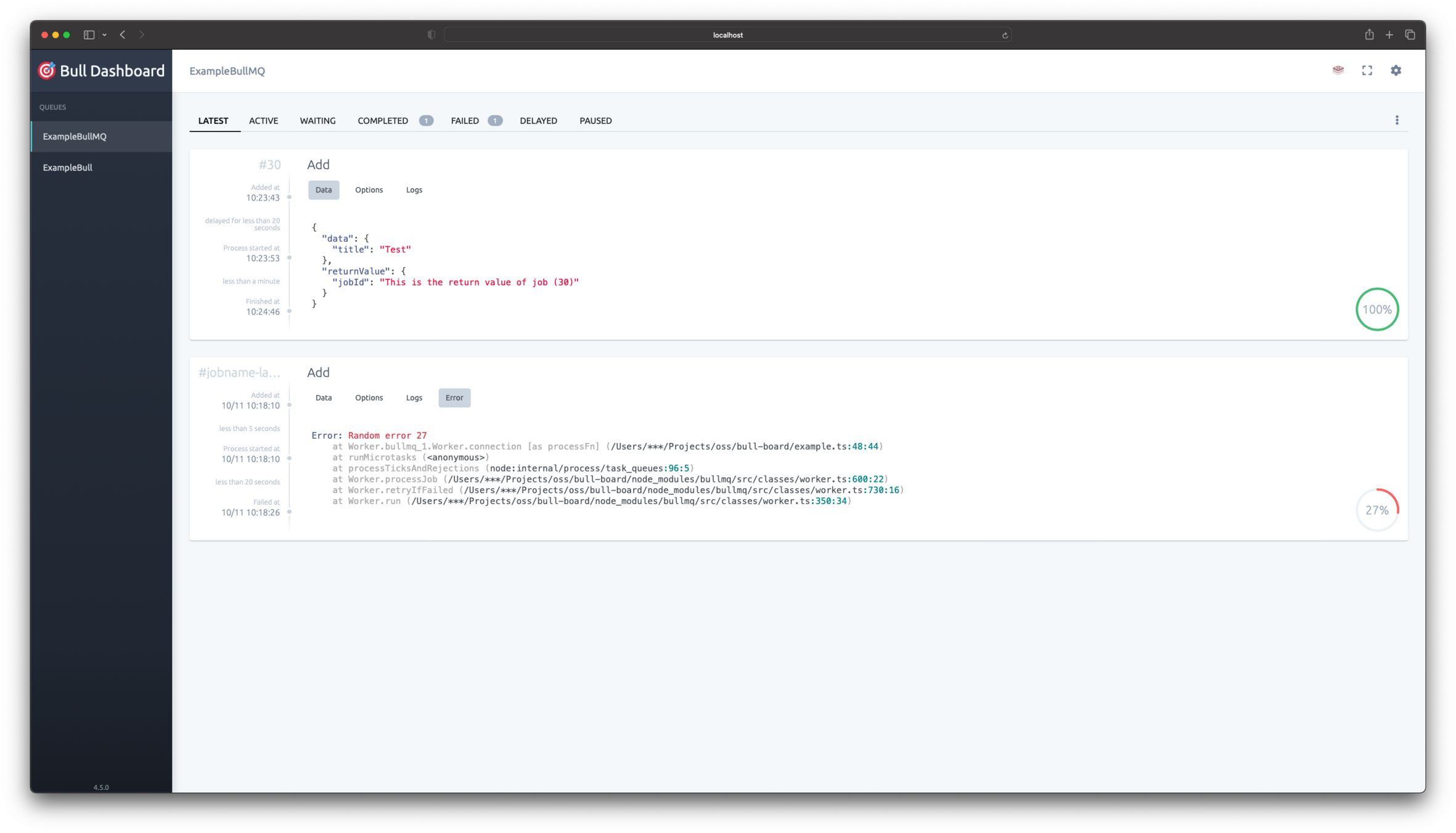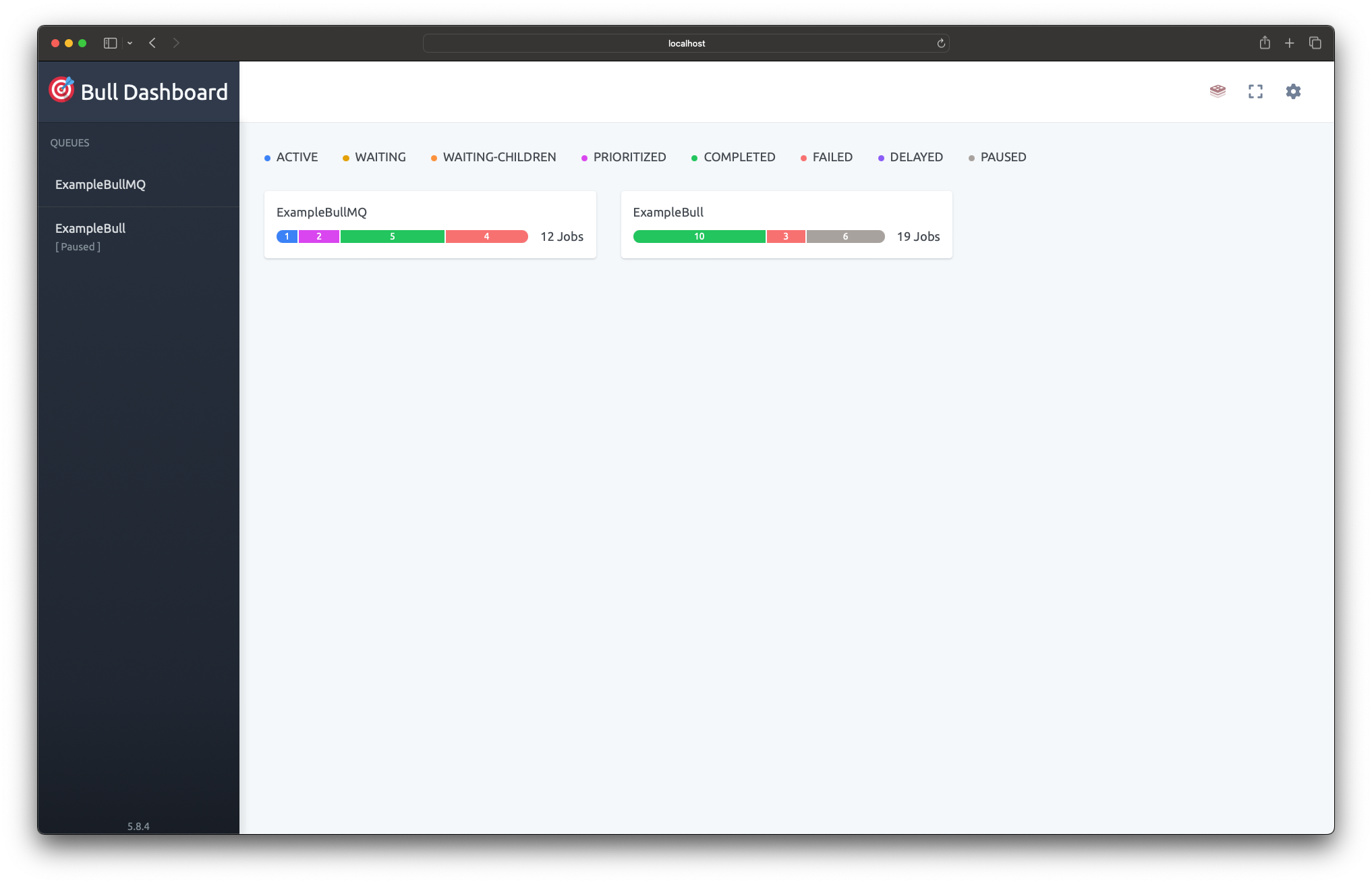 Possui um pacote NPM que permite visualizar filas, trabalhos, falhas e novas tentativas, além de permitir pausar e retomar filas