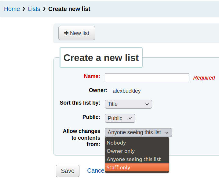 Add option to make a public list editable by library staff only