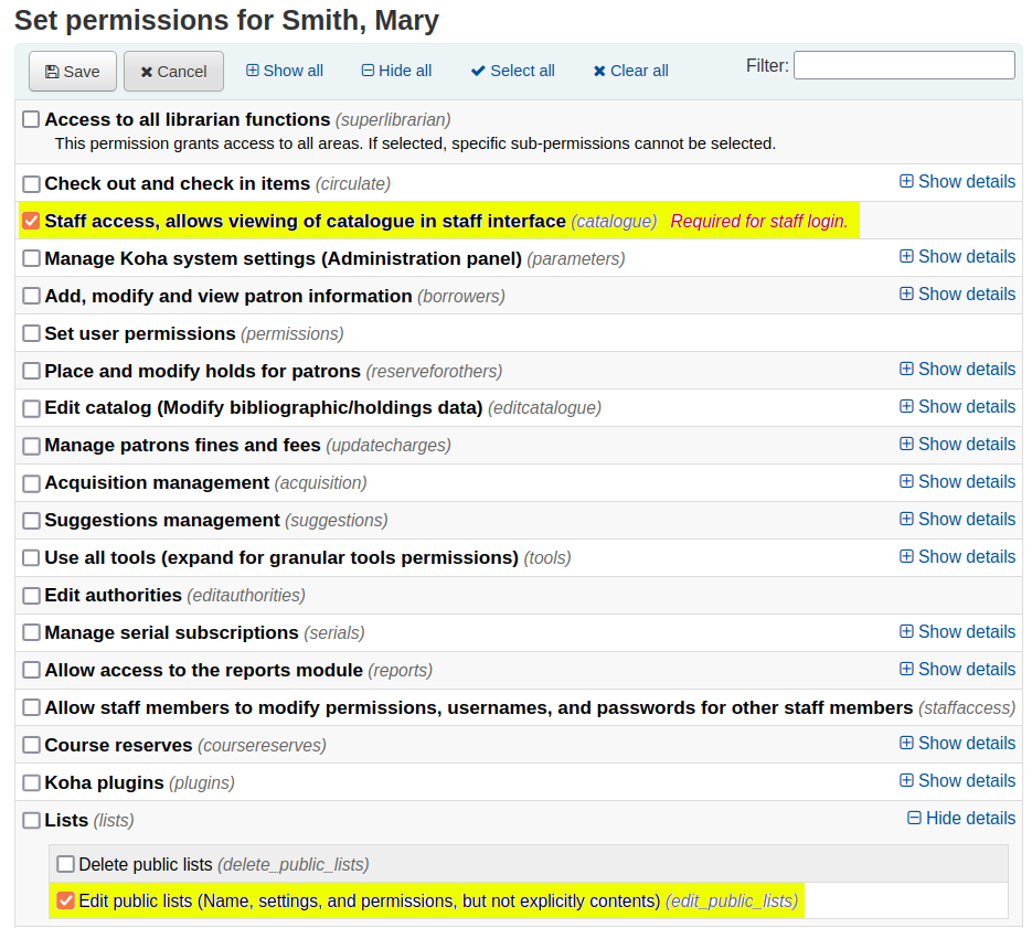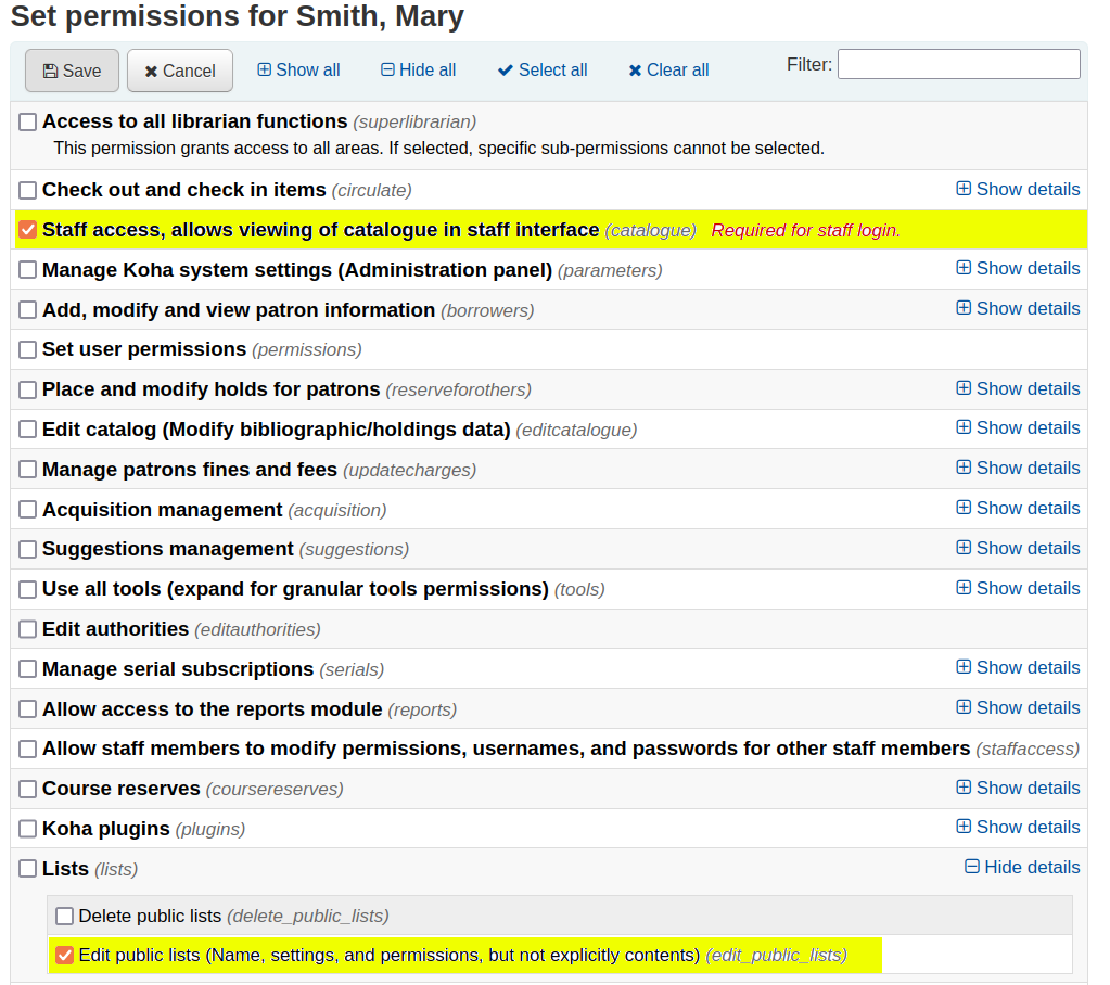 - Ask a superlibrarian patron or a staff patron with the 'edit_public_lists' sub-permission to edit the existing public list