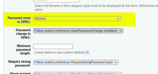 3. Set patron category 'Password reset in OPAC' input to 'Allowed'