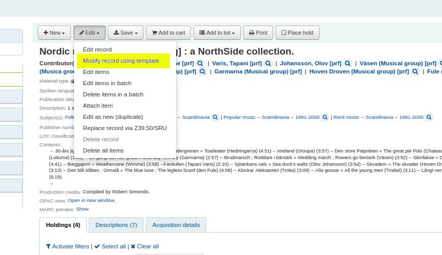 - Add option for using a MARC modification template on a single record from the details page