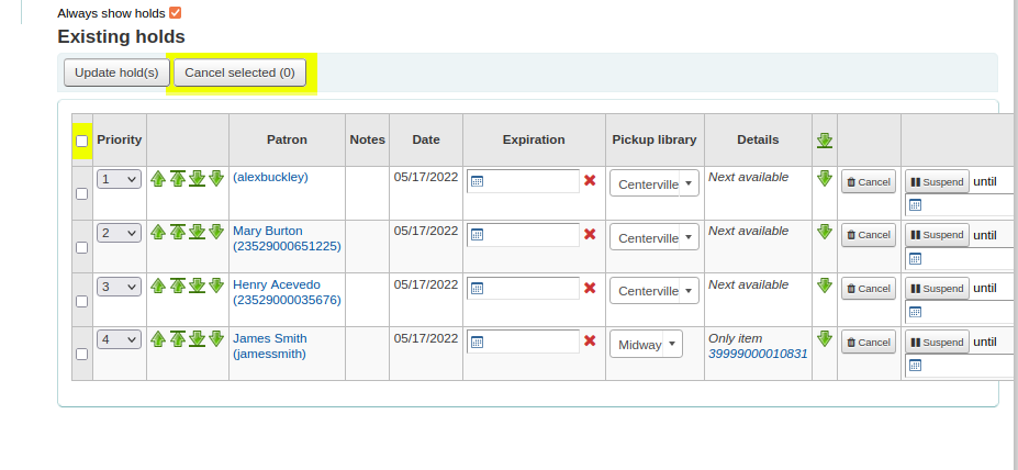 - Cancel holds in bulk