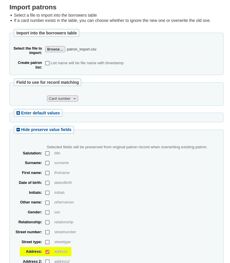 - Add ability to preserve patron field from being overwritten by import