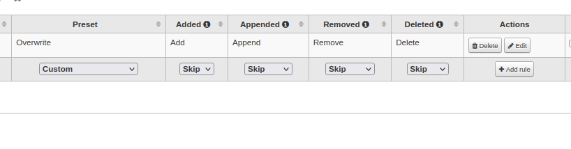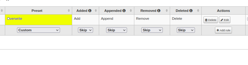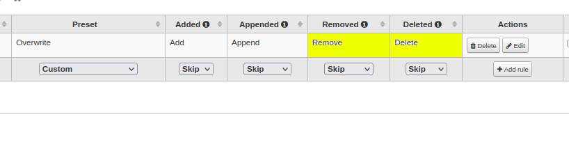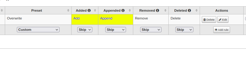 For every rule we define 4 actions: added, appended, removed, delete.