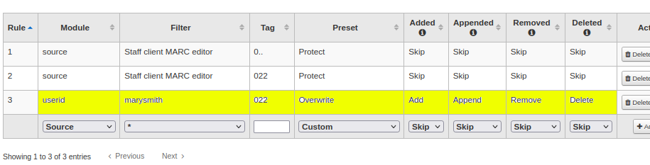 - Preset, added, appended, removed, deleted define what our rule is going to do (highlighted green)