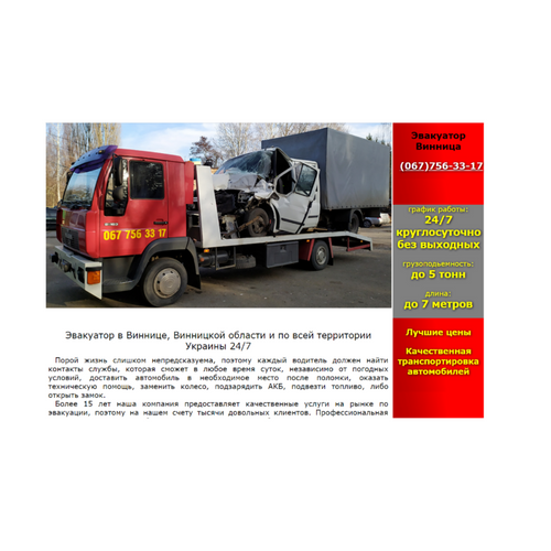 Предлагаем услуги евакуатора по Виннице и всей Украины. Каждый водитель может попасть в ситуацию, когда машина ломается в самий неподходящий момент. В таком случае вам понадобиться служба эвакуации. http://evakuator24.vn.ua