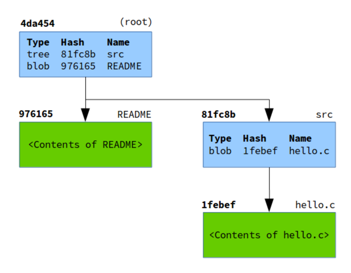 - tree objects, which are a bit like directories. Tree objects can contain pointers to blobs and other tree objects.