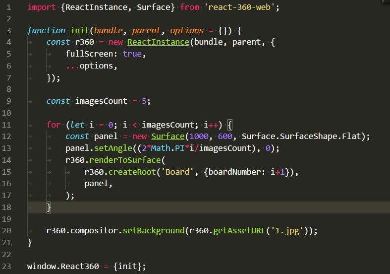 Each React 360 application is made up of two pieces: your React application, and the code that turns your React components into 3D elements on the screen.