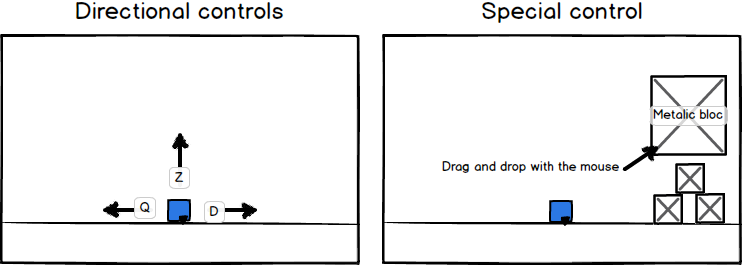 - Le joueur évolue dans un monde 2d en mode sidescrolling, il se déplace avec les touches Z,Q et D. Il ramasse les collectibles en appuyant sur E et peut déplacer des objets à l'aide de sa souris.