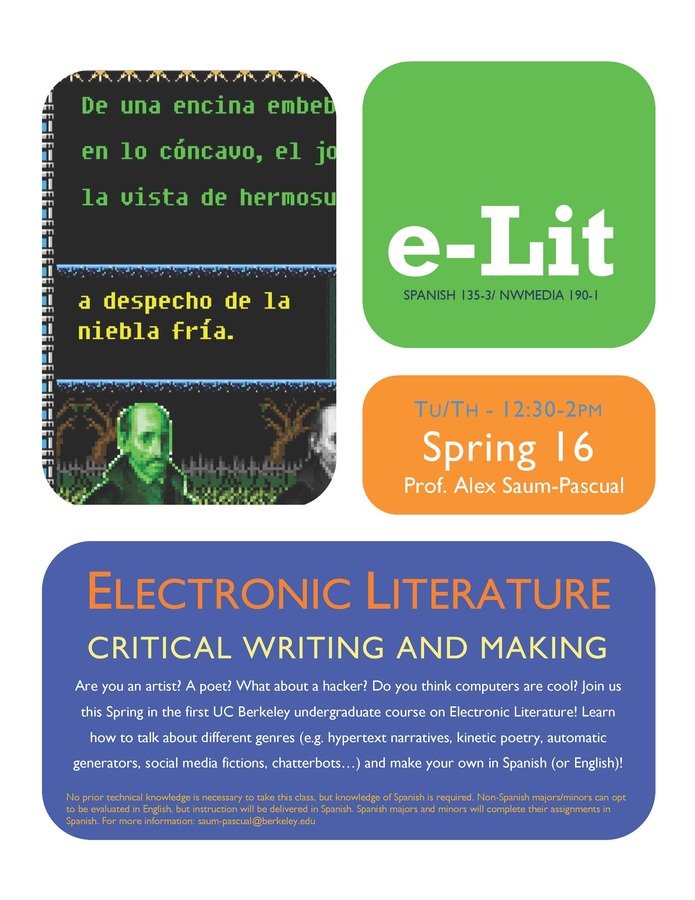 “e-lit, refers to works with important literary aspects that take advantage of the capabilities and contexts provided by the stand-alone or networked computer” (ELO)