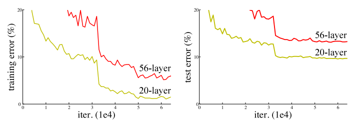 Training error (left) and test error (right) on CIFAR-10 with 20-layer and 56-layer “plain” networks.