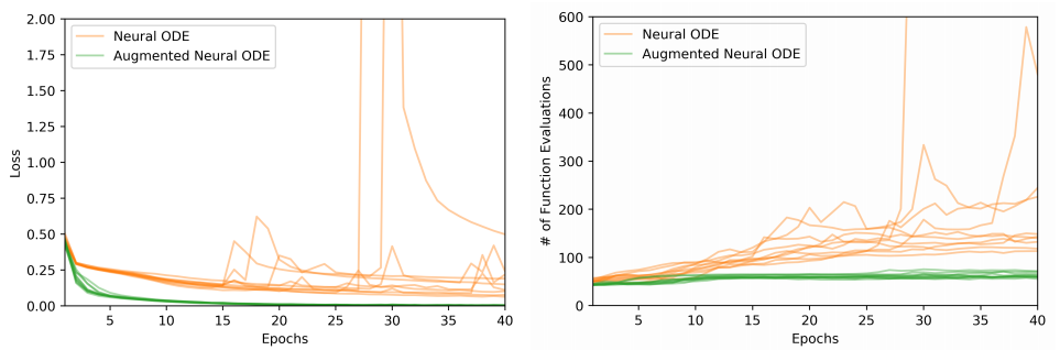 Instabilities in the loss (left) and NFEs (right) on MNIST