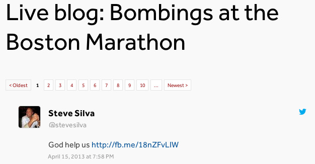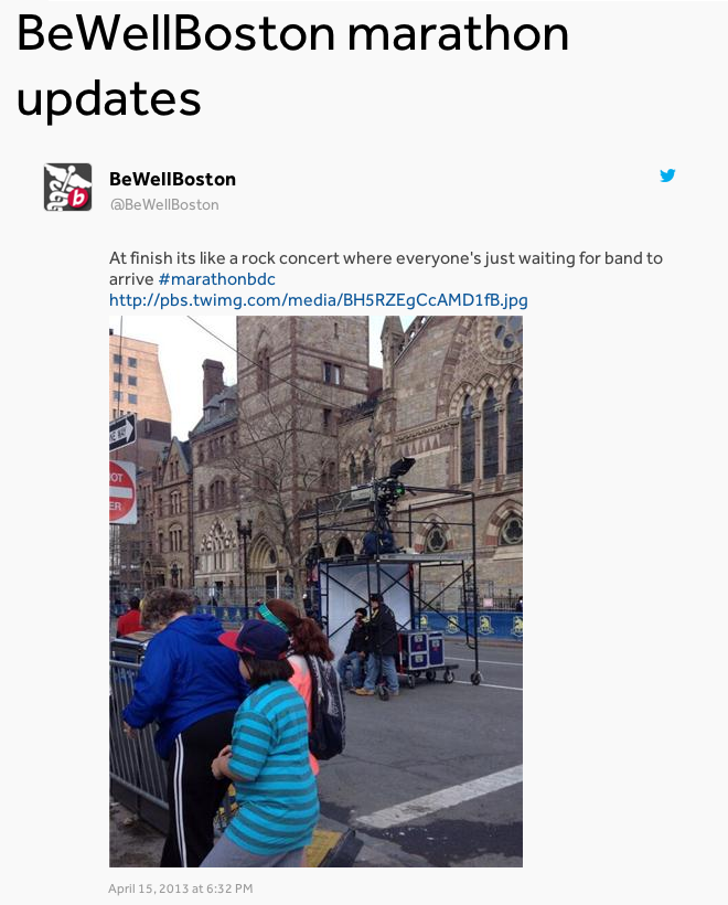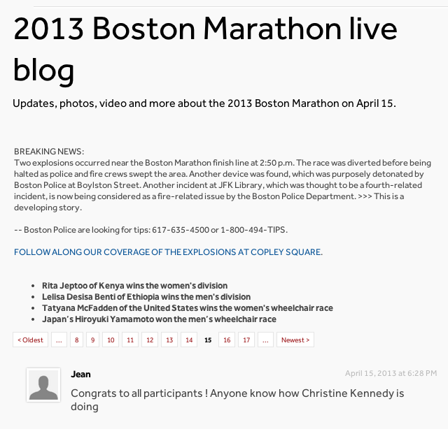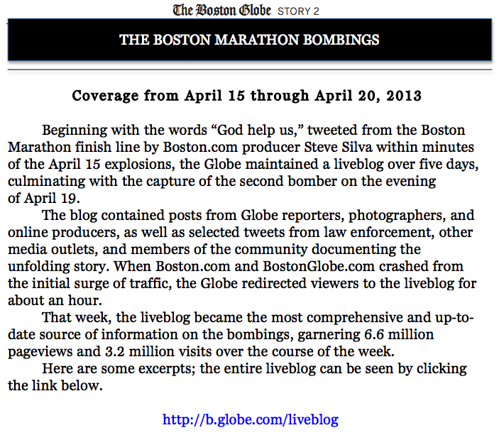 Friends told me after the fact that they sat with eyes glued to that feed for days. It was a really important resource, as was the Globe's comprehensive, long-form coverage of the events.