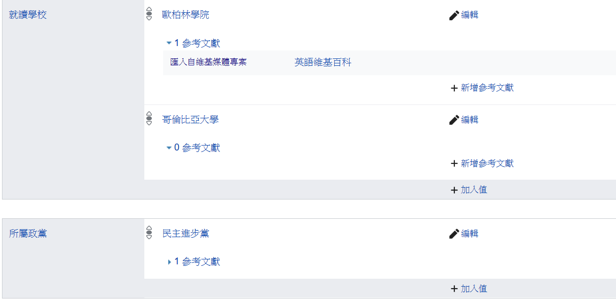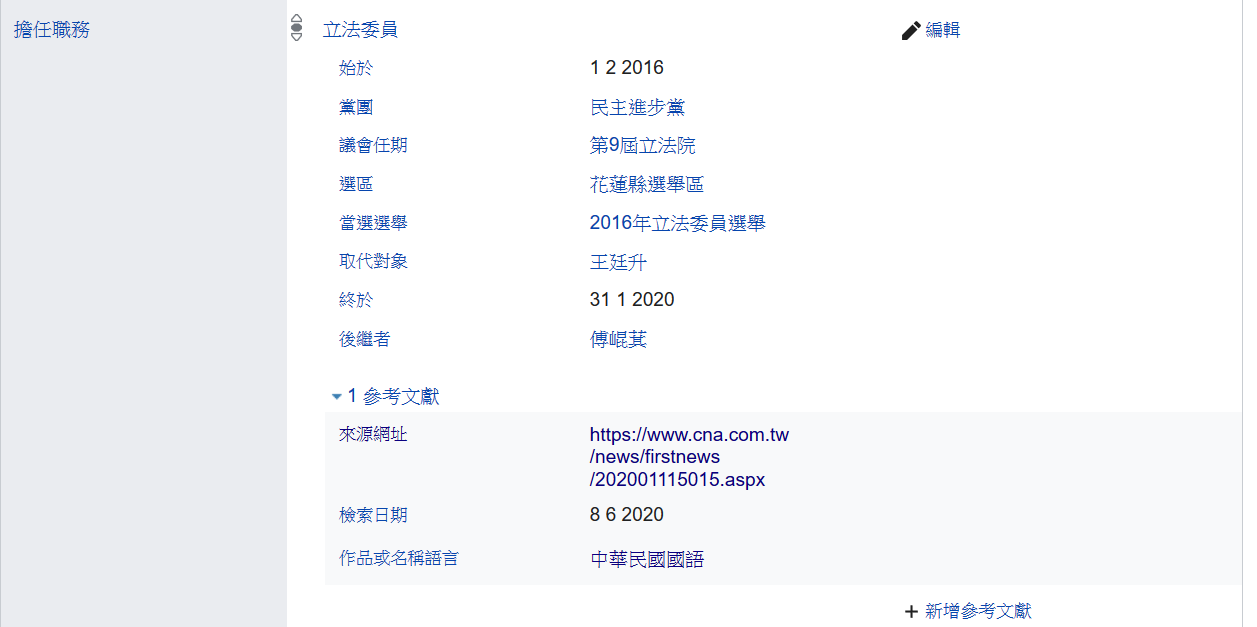 所屬政黨(P102):以公開報導與文獻為主,無黨就寫"無黨籍政治人物"