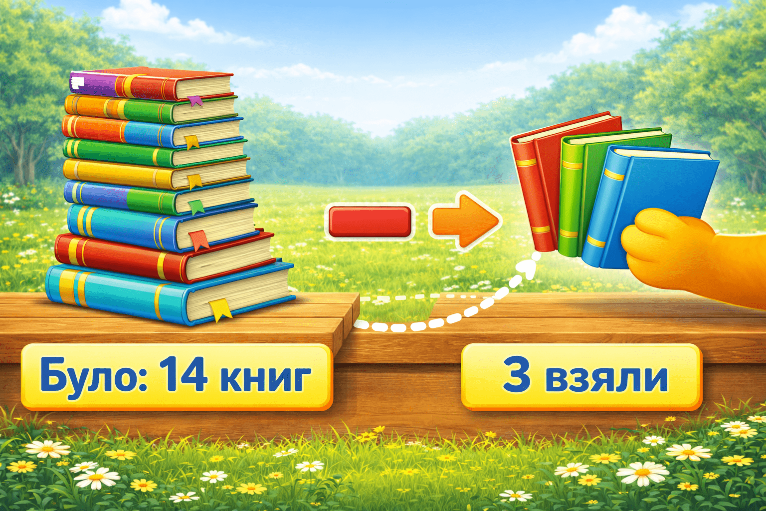 На столі було 14 книжок, Чарлі забрав почитати 3. Скільки книжок залишилось на столі?