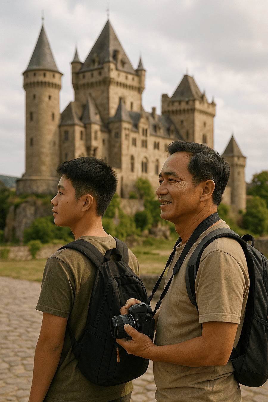 1. Minh and his dad travelled to Europe and stayed in a hotel / police station for 3 days.