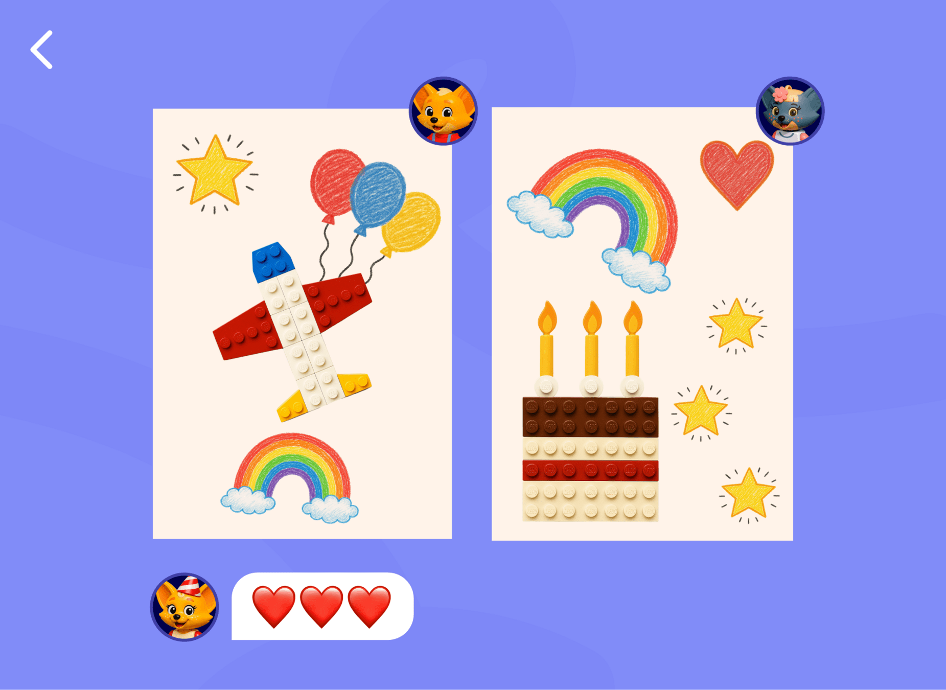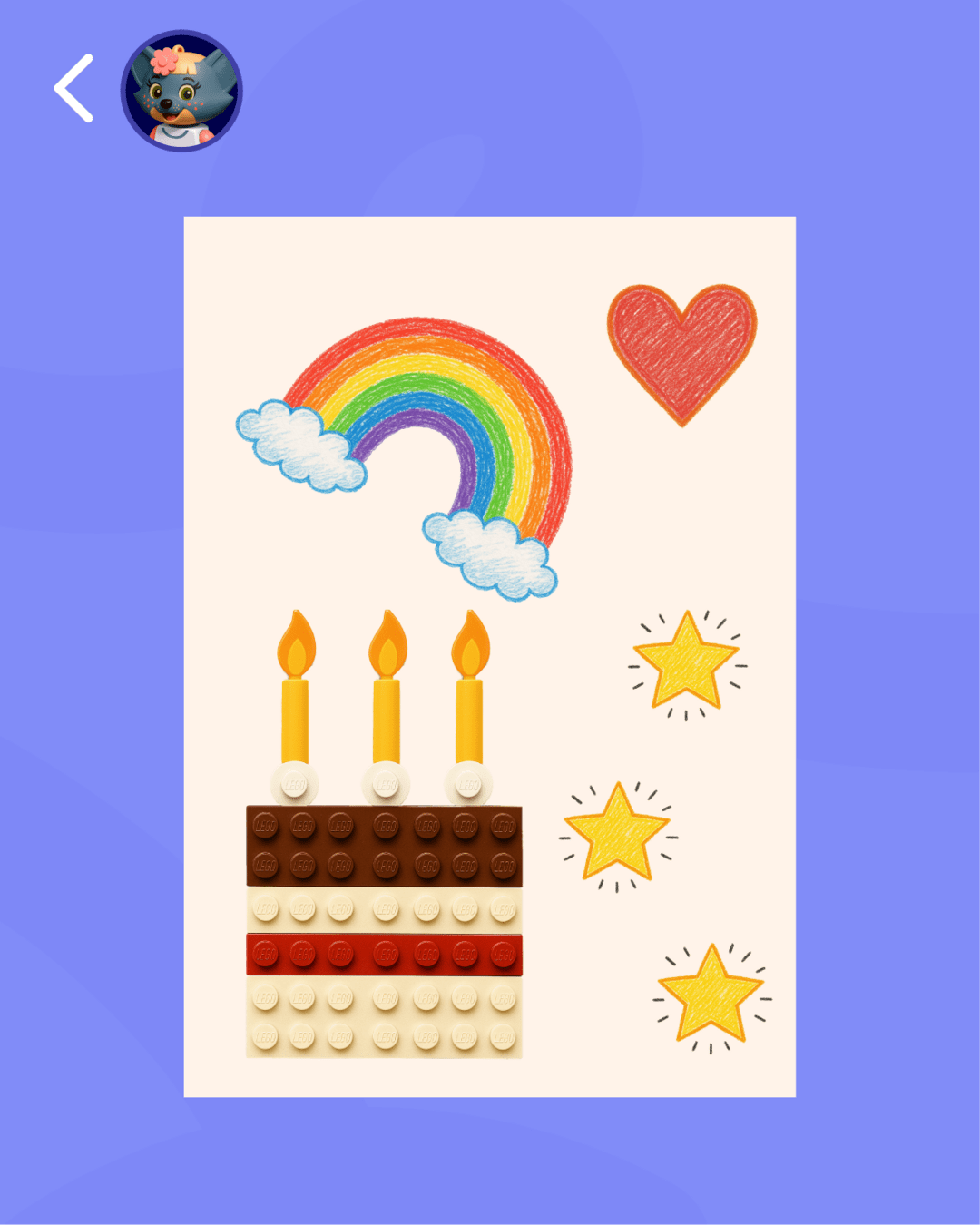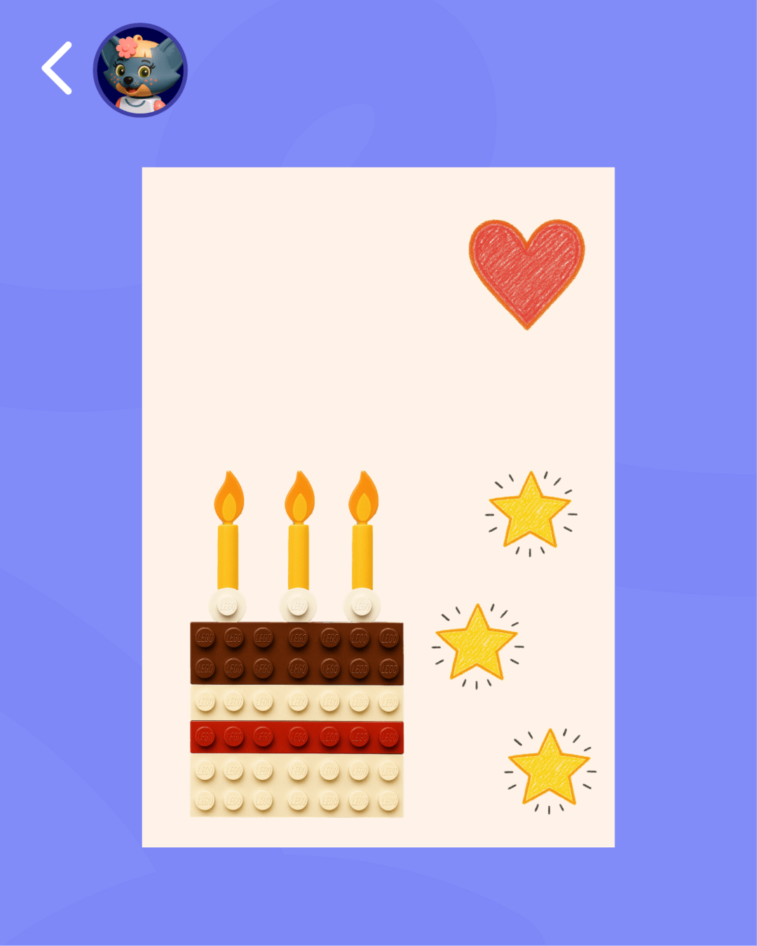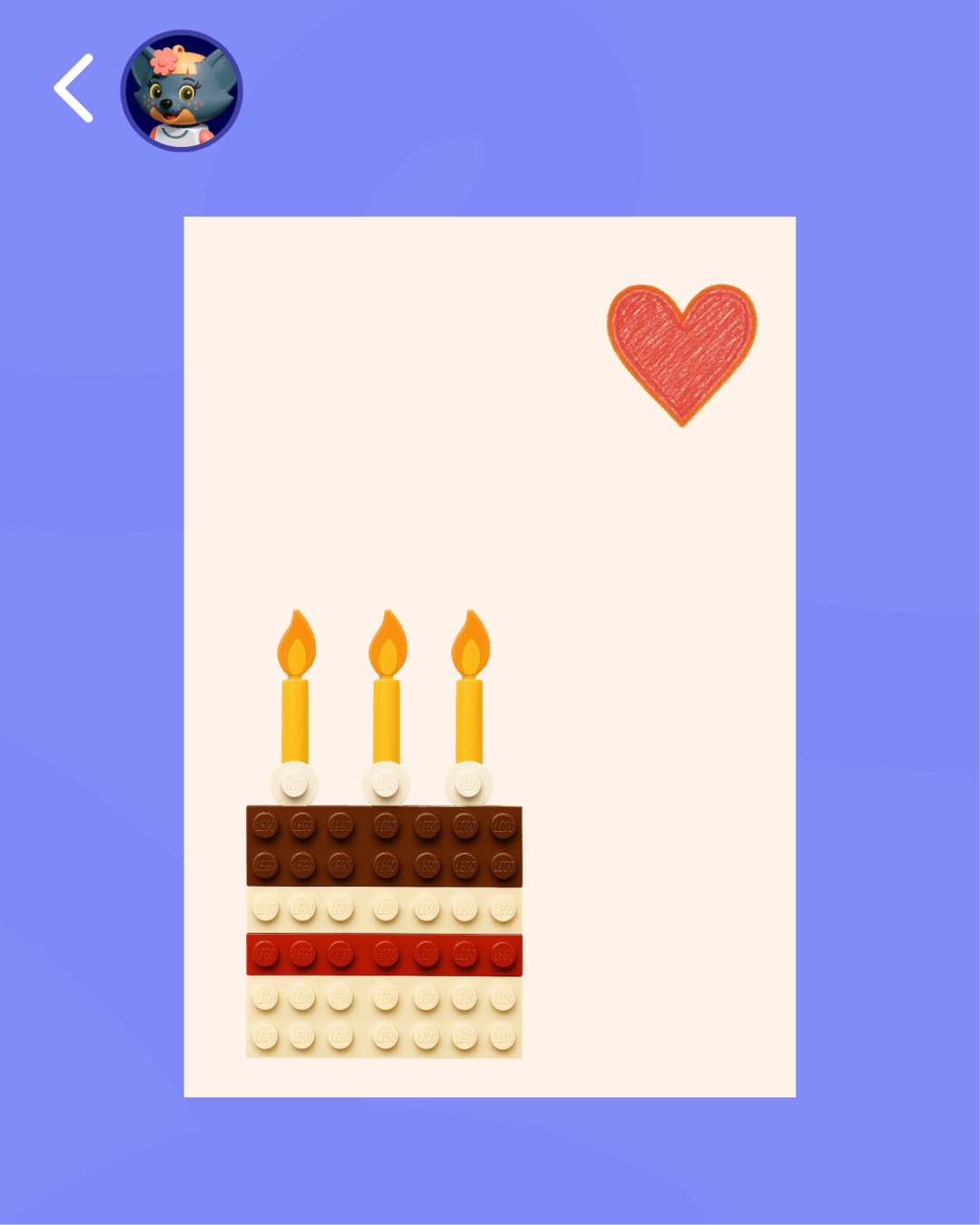 Look! Lego app. You can make a card here! (pause) Let’s build a cat! (нажимаємо на вибір котика, він вибудовується) (pause), Let’s add a heart and some balloons! (pause). What a nice card!