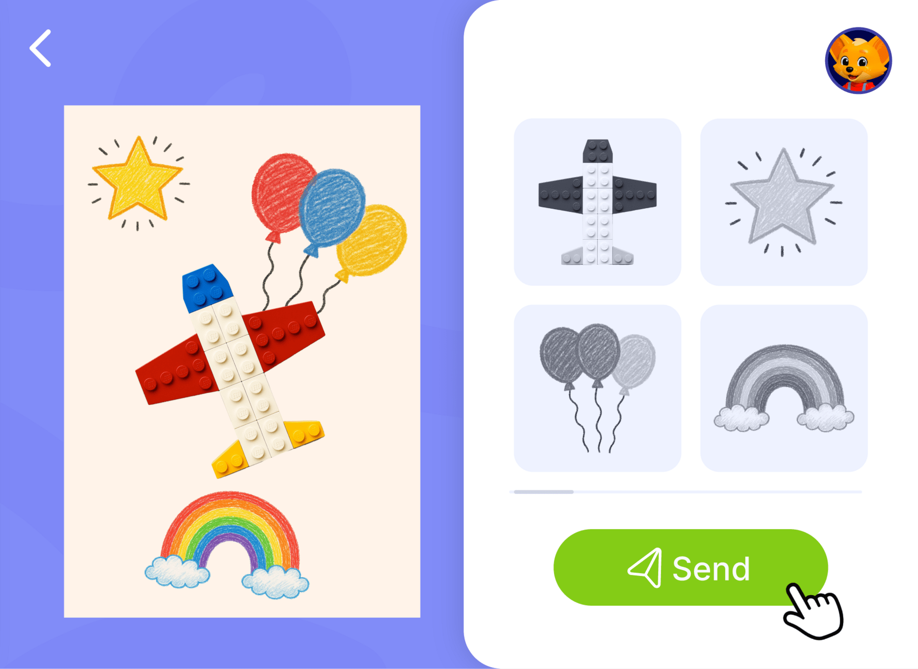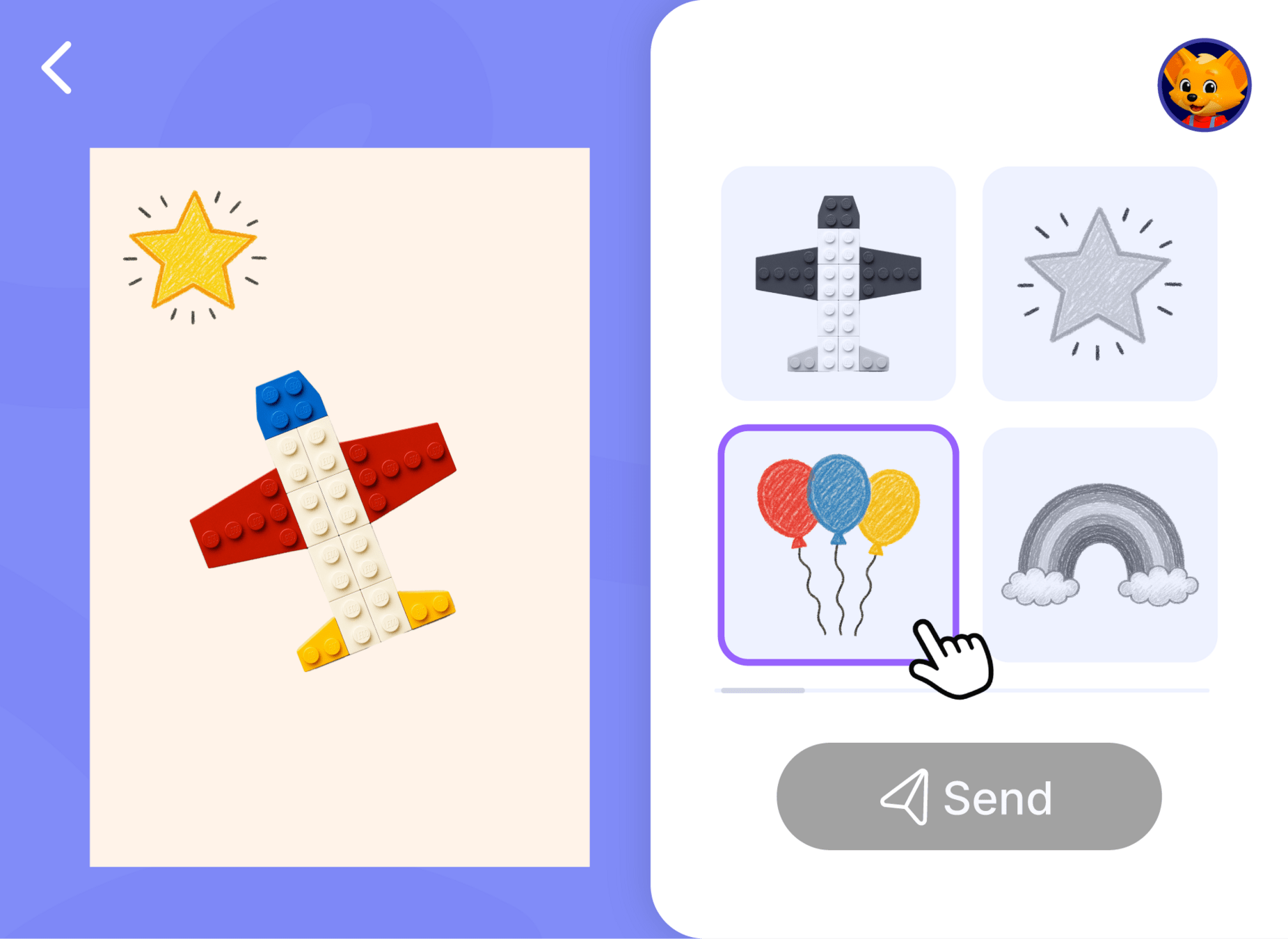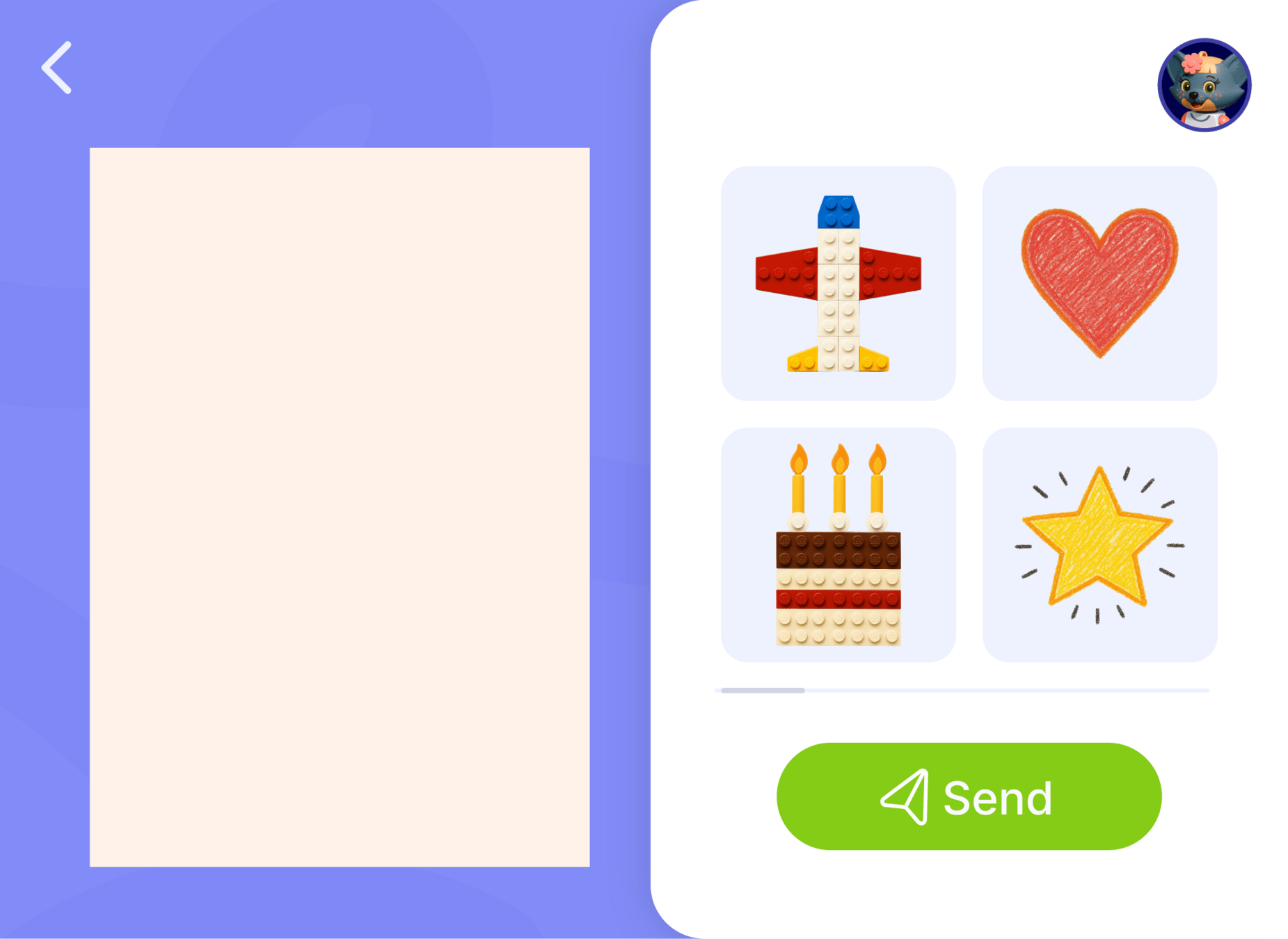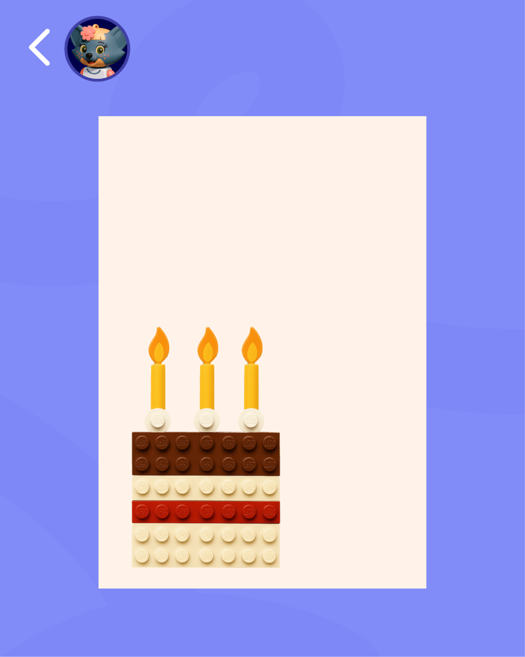 Look! Lego app. You can make a card here! (pause) Let’s build a cat! (нажимаємо на вибір котика, він вибудовується) (pause), Let’s add a heart and some balloons! (pause). What a nice card!