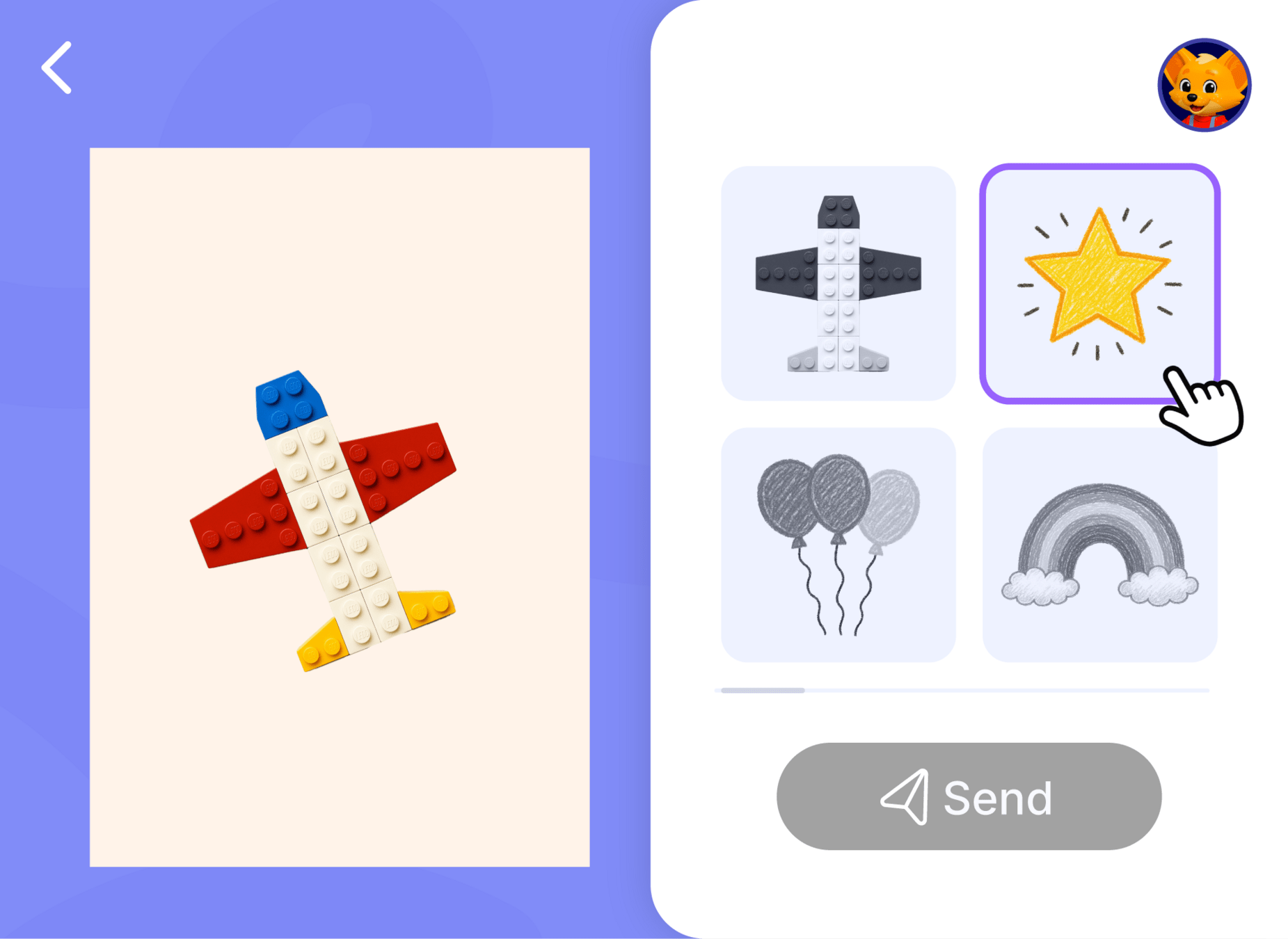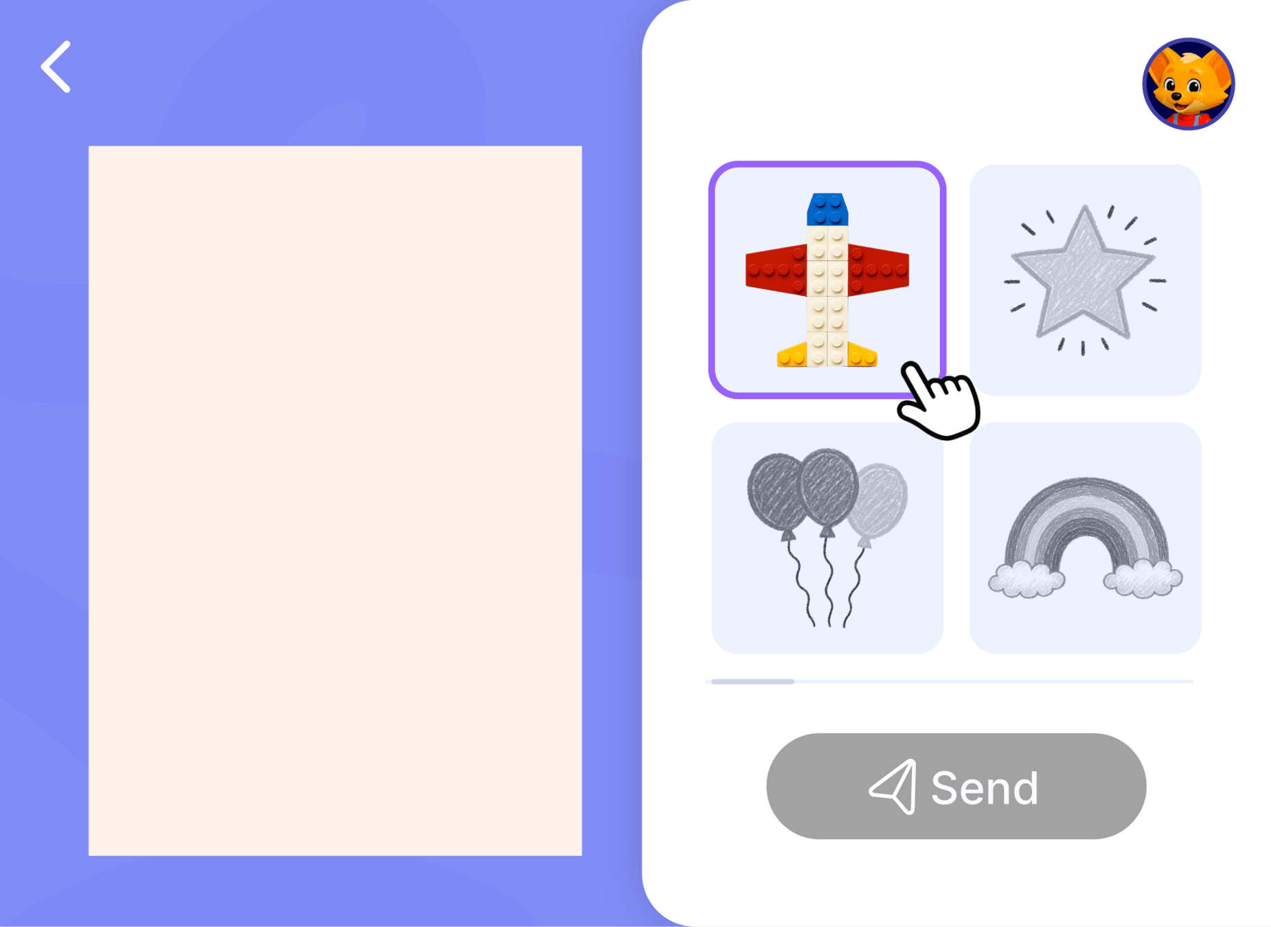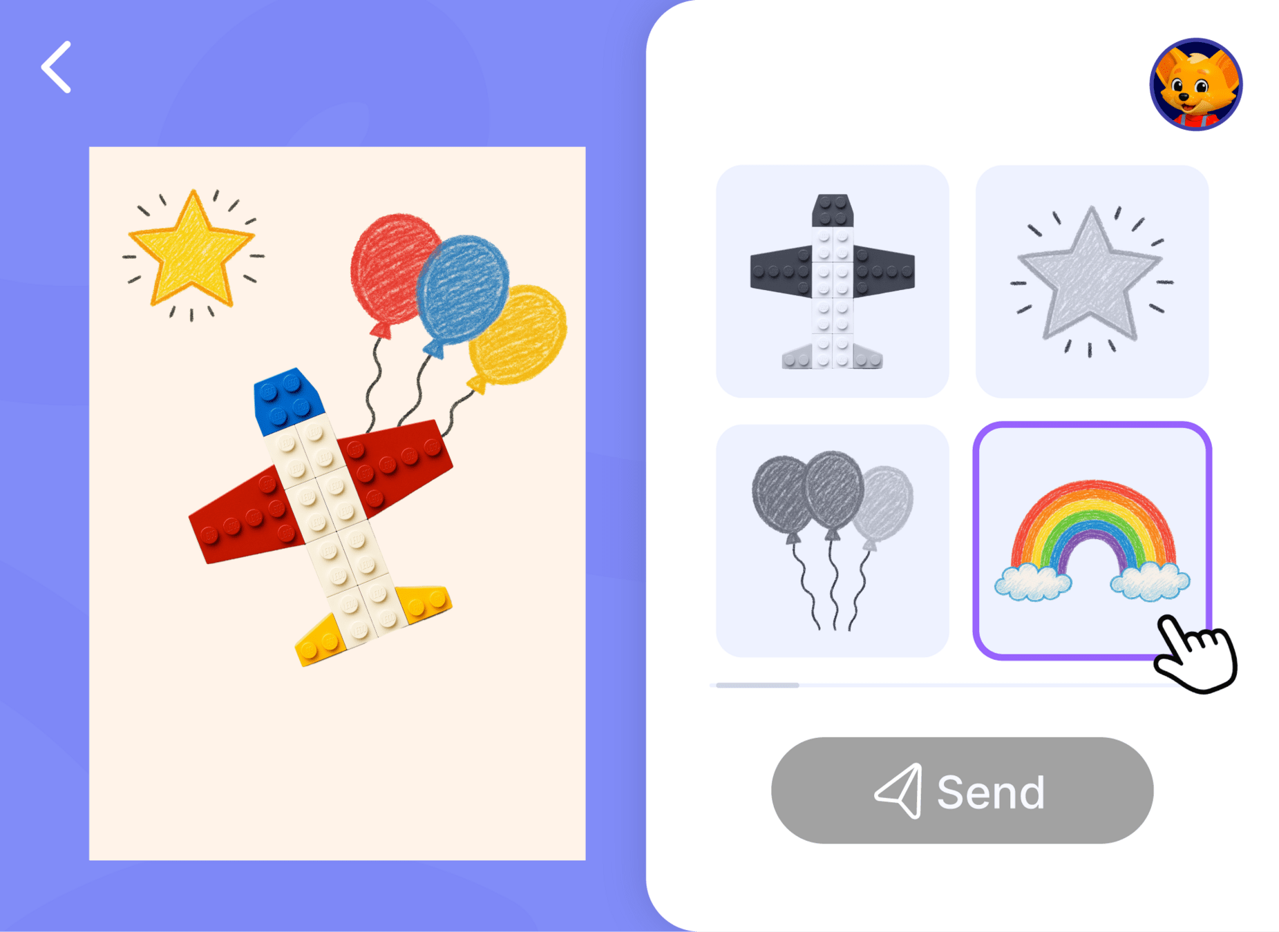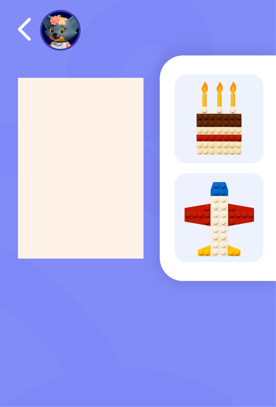 Look! Lego app. You can make a card here! (pause) Let’s build a cat! (нажимаємо на вибір котика, він вибудовується) (pause), Let’s add a heart and some balloons! (pause). What a nice card!