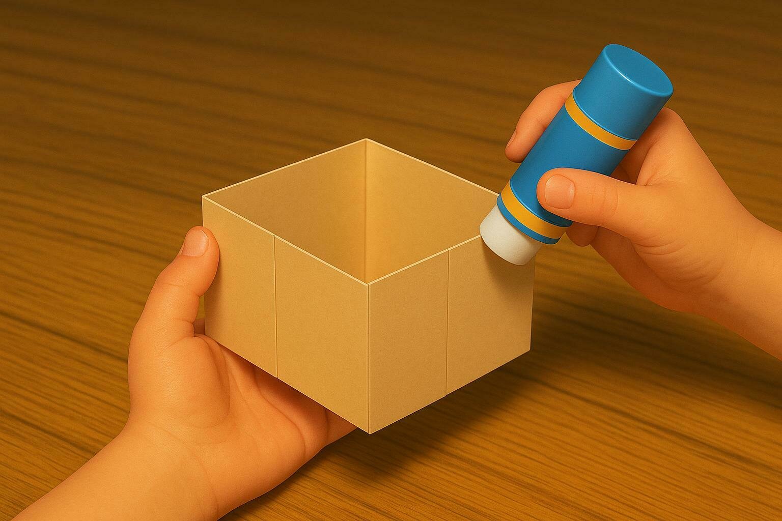 After that, take the four rectangles and arrange them into a square shape. Glue the edges together one by one to form a box.
