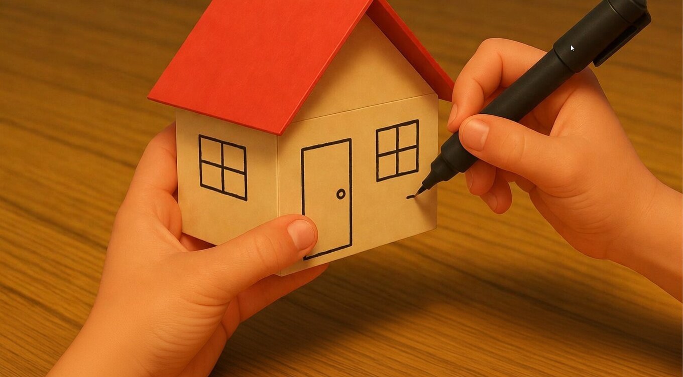 Finally, draw and decorate the door and windows using crayons or markers.