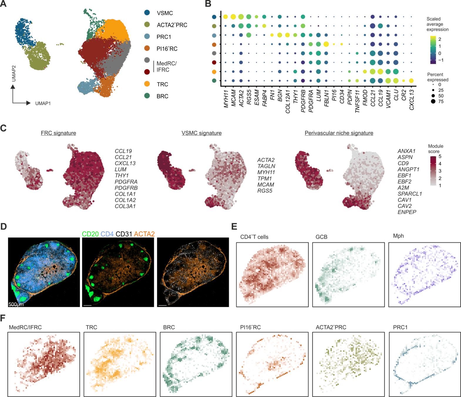 Localization of perivascular reticular cells in human lymph nodes using spatial transcriptomics and scRNAseq data → tool for celltype decomposition