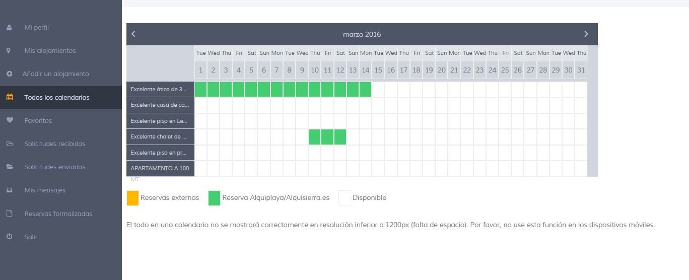 Si tienes más de un alojamiento publicado en el portal podrás desde aquí ver la disponibilidad de todos de una manera muy fácil, para de esta manera poder ofrecer a los usuarios las viviendas que tengas disponibles en unas determinadas fechas.