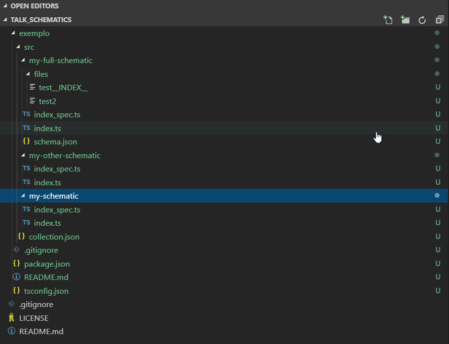 npm i -g @angular-devkit/schematics-clischematics schematic --name exemploschematics blank --name meuSchematic{