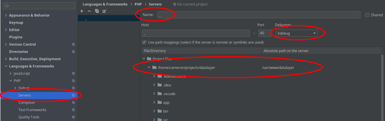 Create a new "server" in the Servers section, take note of the name you use, as it's used in the Xdebug config.