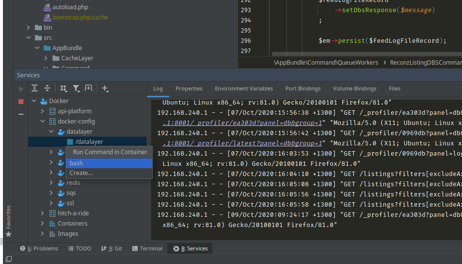 Once all set up, can access your docker containers from the Services tab, and can run commands inside the container easily