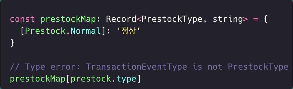 디비 모델의 데이터 타입은 입고와 출고의 타입이 합쳐진 타입이다. 하지만 클라이언트에서 입고 데이터는 입고 유형만 가져야한다. 입고 타입을 TransactionType에 맞추려다 보니 에러발생, 이를 해결하기 위해 타입가드나 부정확한 타입 지정등 추가 코드 작성을 하여 타입 문제를 해결한다.