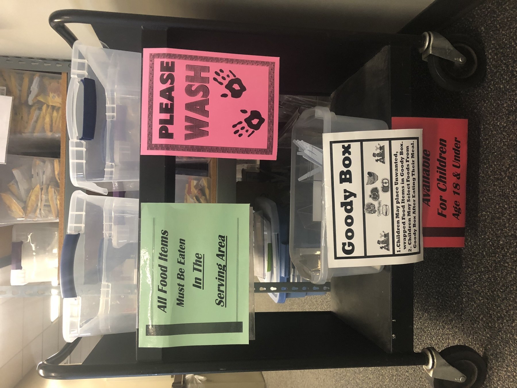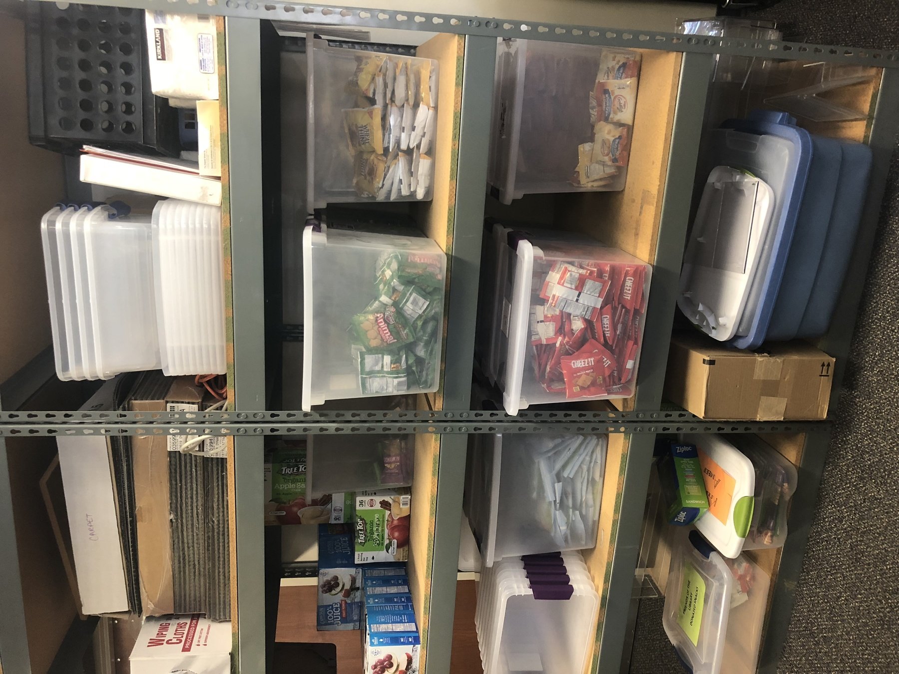 Using CACFP money we purchased storage tubs. All the food items take up 4 shelves.