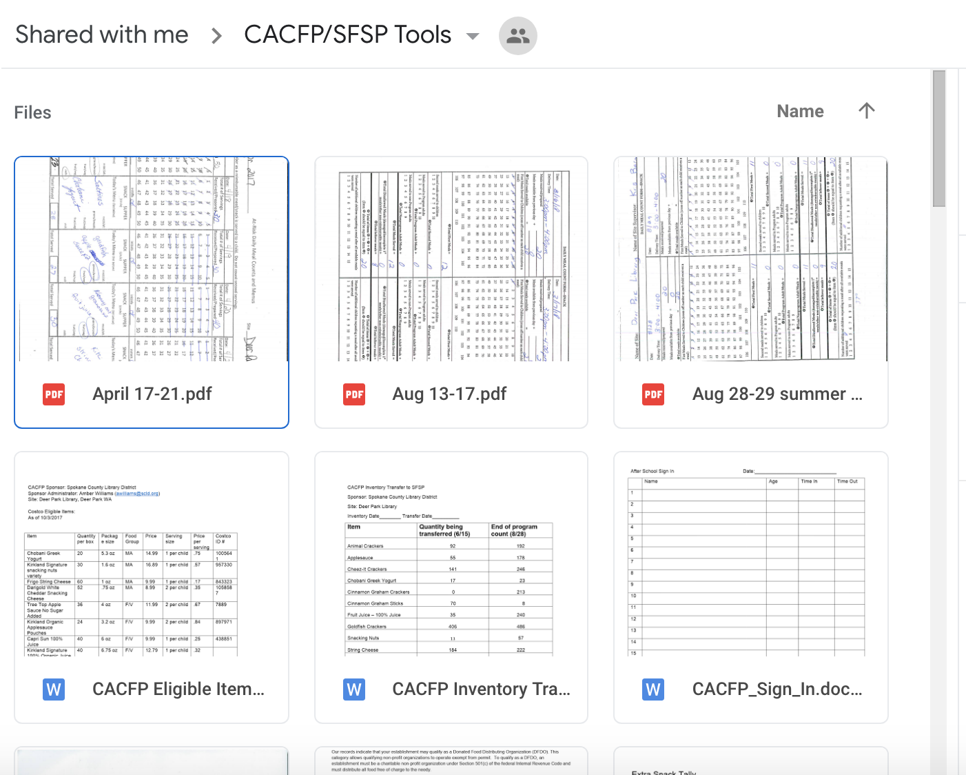- The CACFP specialist list by county is in the Google folder.