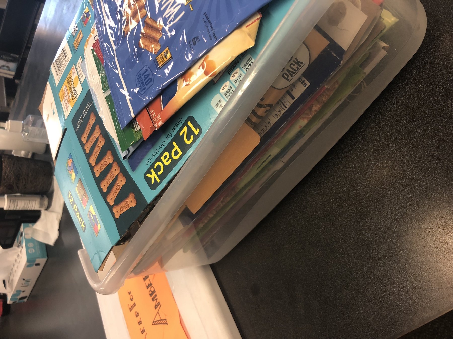 - Unopened unwanted snack items go here, kids who want more snack can take from there.